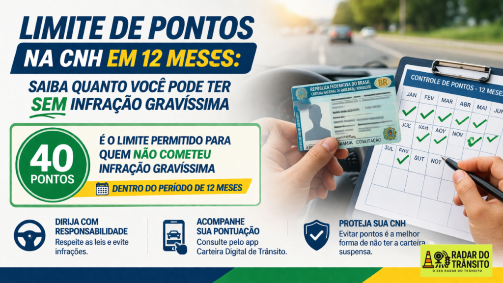 O limite de pontos na CNH em 12 meses é de 40 pontos para condutores que não cometem infração gravíssima.