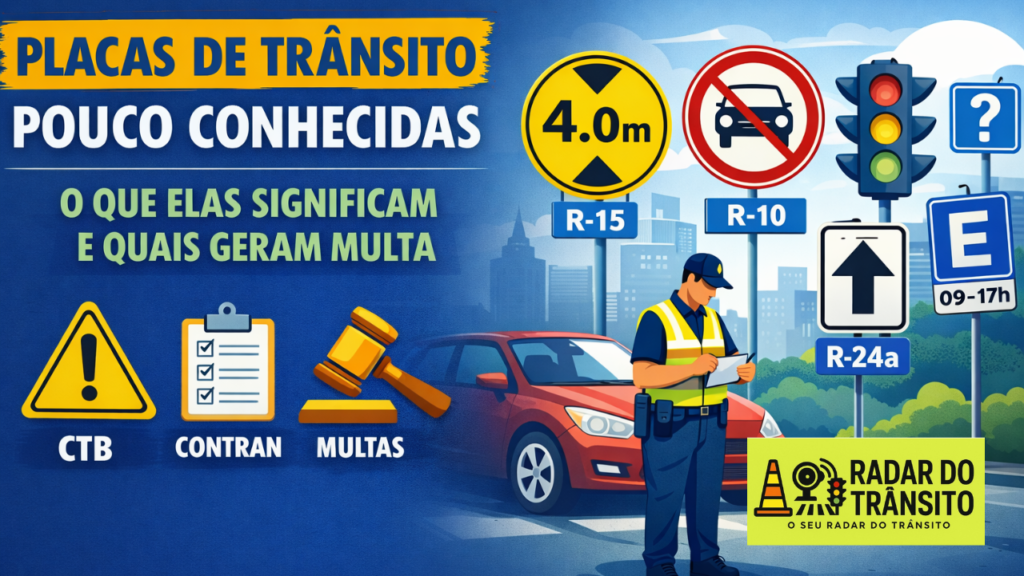 Neste artigo, você vai entender quais são as placas de trânsito menos conhecidas, o que cada uma significa e, principalmente, quais realmente geram multa, sempre com base na legislação vigente.