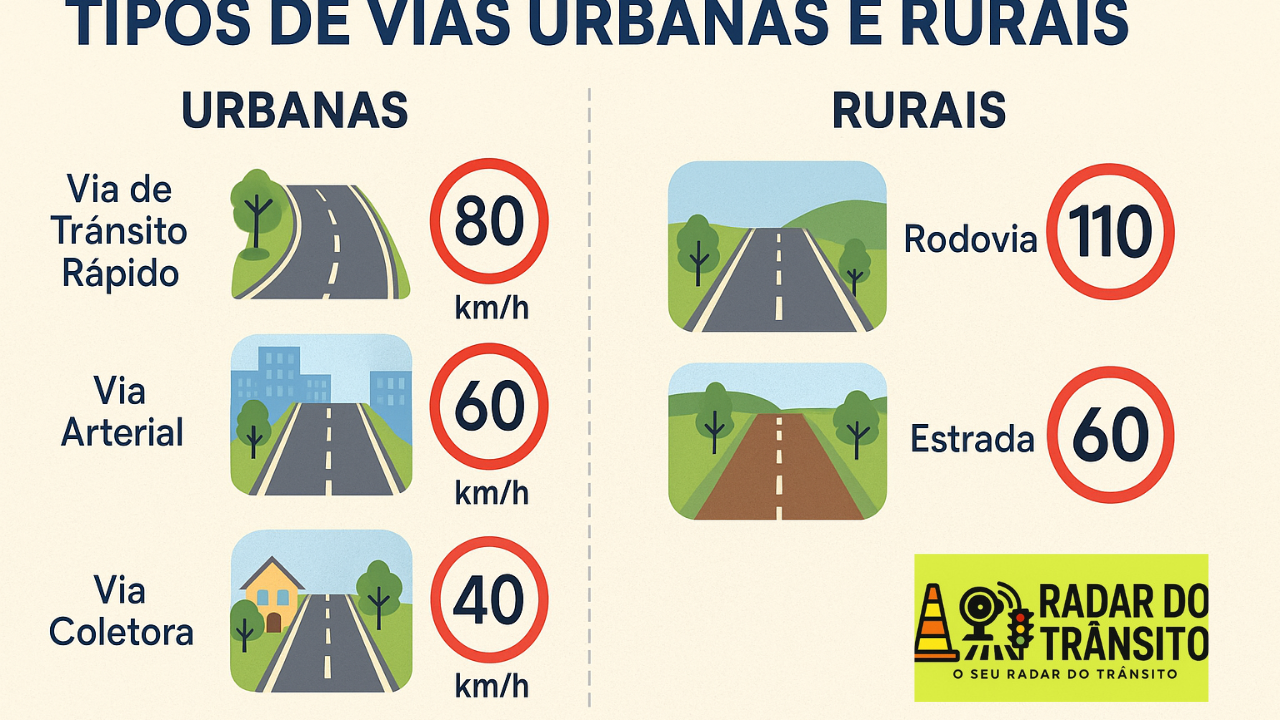 Essas subdivisões garantem que cada condutor reconheça rapidamente o ambiente e adote a velocidade ideal quando não há placas de regulamentação.